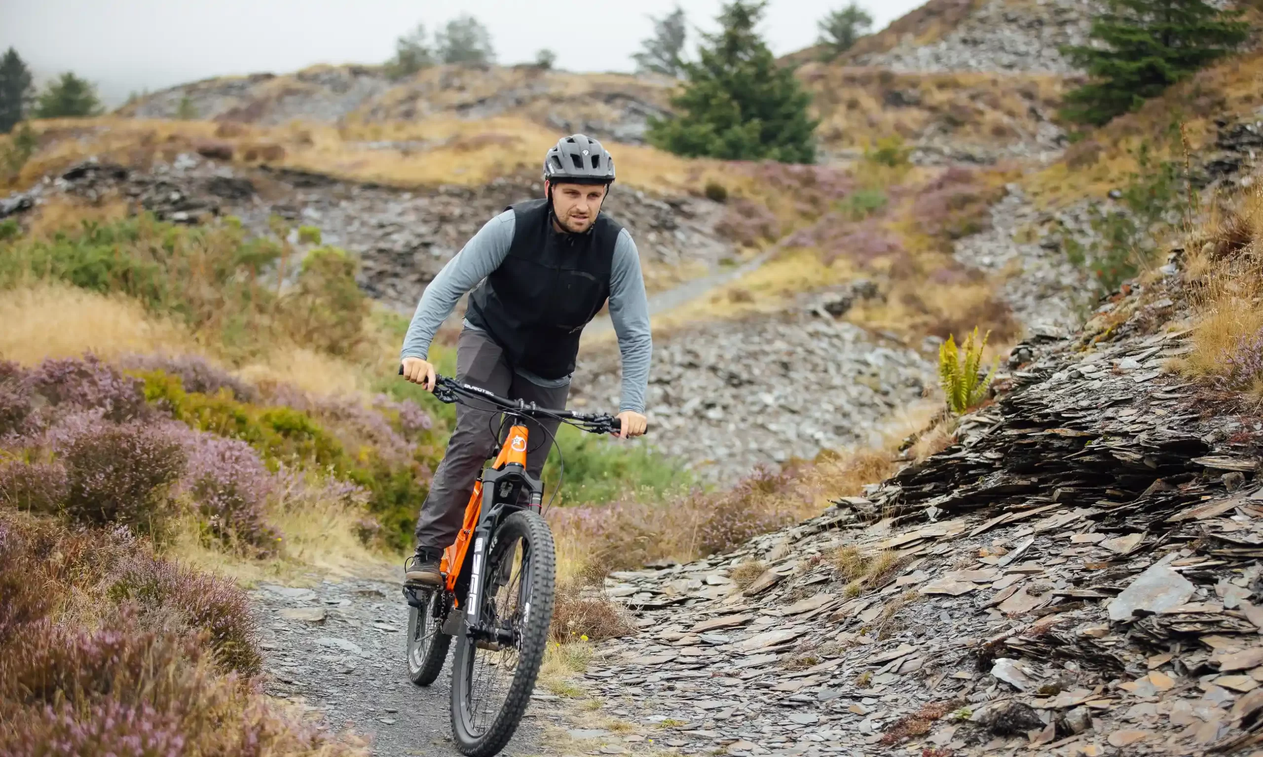 At this time of year, low light and thick tree cover mean the valley is wrapped in gloom, but we ride only a few hundred metres before splashing through a ford and then climbing out of the valley on a steep, muddy ascent that would be virtually impossible on a regular mountain bike. In minutes we find ourselves puffing and panting (yes, even on e-bikes) on the shoulders of the Preseli hills.