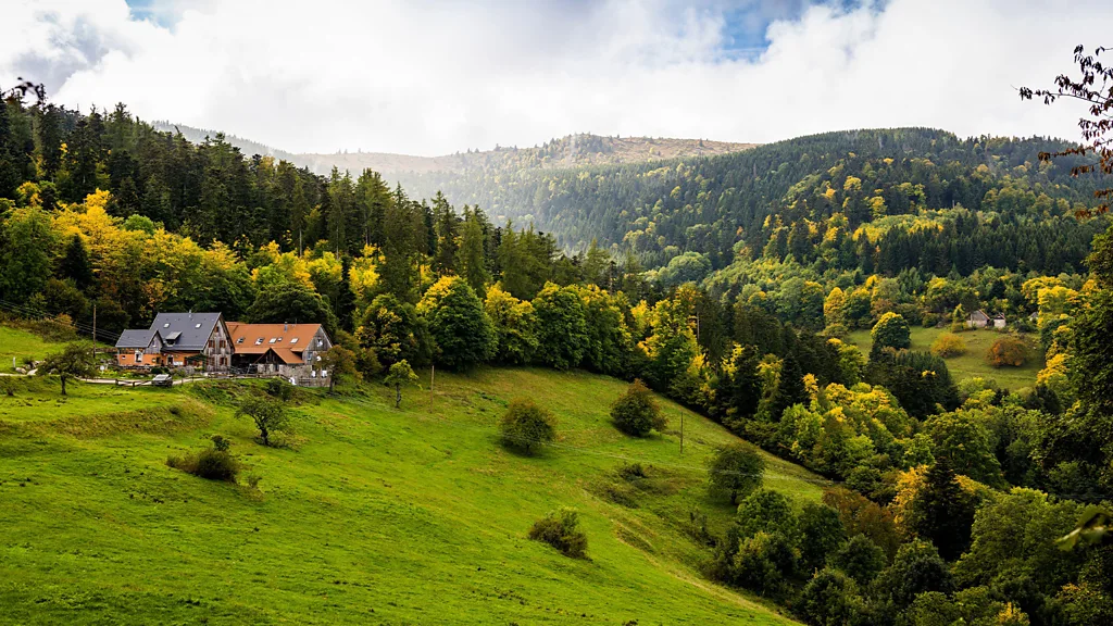 I’d been hiking for five hours and a fine, freezing rain had just begun to fall. Some years, I’ve been told, May in eastern France’s Vosges mountains can be almost aestival; others, it’s stormy and frigid. Distant cow bells interrupted the near-silence, and I unfolded my waterlogged map, peering at a small dot that was rendered real as I climbed a hill and finally glimpsed a long stone building whose red roof stood out against the rolling green hills, its windows glowing with promised warmth. I had reached Rothenbrunnen, a ferme-auberge (farm-inn) typical of these verdant pastures, and my home for the night.