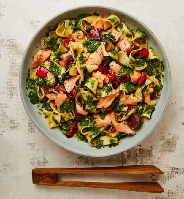 Transfer the pasta to a large platter, top with the flaked salmon and spoon over the salsa. Finish with plenty of black pepper and serve.