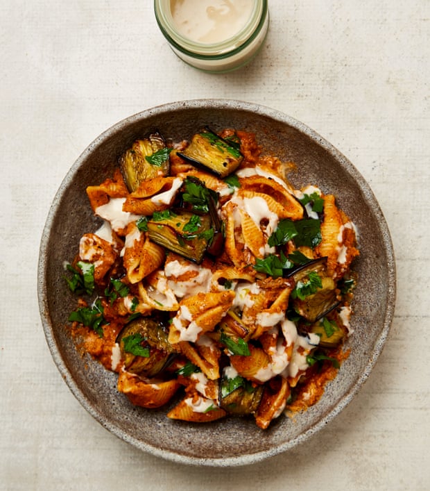 Pasta shells with burnt aubergine and tahini