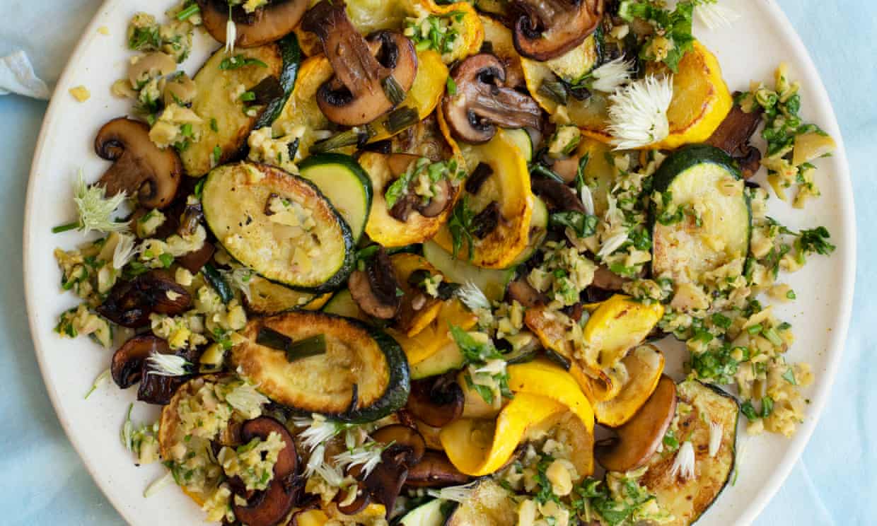 Scatter the olive and lemon dressing over the mushrooms and courgettes and transfer to a warm serving plate.