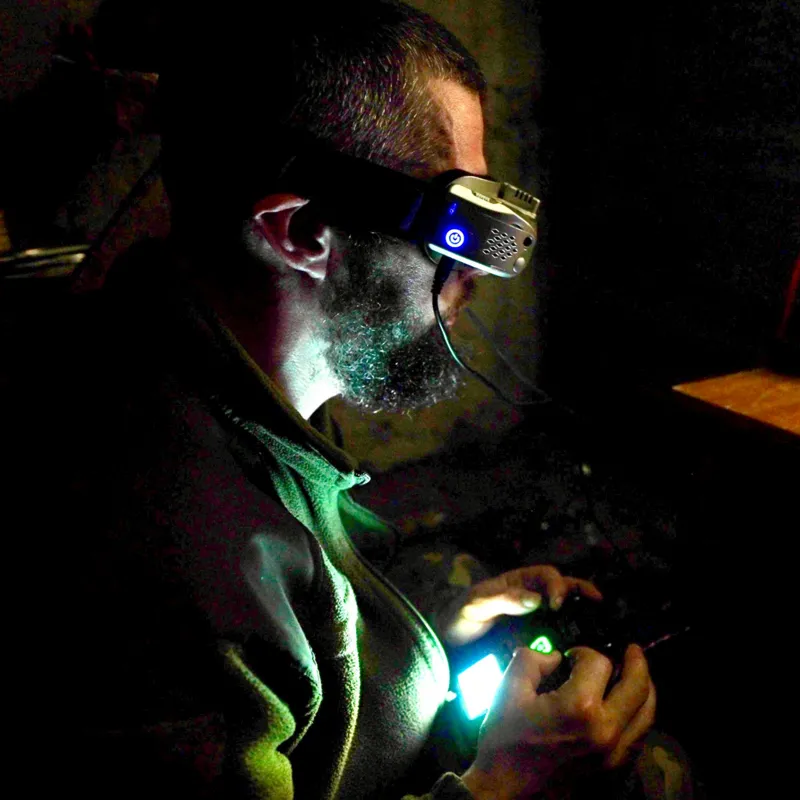The largest drone in the brigade’s arsenal is the Vampire, which with its six rotors is the size of a coffee table. Again we join Aeneas on another mission in Lyptsi after dark, under the sound of constant artillery fire, where we meet the heavy bomber team. They work to attach the bomb to the drone.